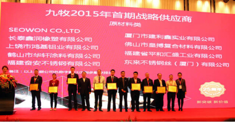 12月7日,“新突破 新價值” 2015年九牧供應(yīng)商年會在廈門拉開序幕。九牧董事長林孝發(fā)在會上深刻闡述了品質(zhì)對于一個企業(yè)的重要性,同時為全體供應(yīng)商規(guī)劃九牧未來的戰(zhàn)略布局、供應(yīng)鏈管理和質(zhì)量管理等方面做了精彩發(fā)言,值得開心的是奮安不銹鋼也被九牧評為優(yōu)秀的供應(yīng)商。