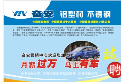 福建奮安集團(tuán)成立于1988年,是一家專(zhuān)業(yè)生產(chǎn)鋁合金型材、不銹鋼管材、門(mén)窗幕墻配件、密封膠的大型綜合性現(xiàn)代化企業(yè),位列“中國(guó)建筑鋁型材二十強(qiáng)企業(yè)”,獲得“中國(guó)馳名商標(biāo)”“中國(guó)十大鋁型材品牌”榮譽(yù)稱(chēng)號(hào),被評(píng)為“最具創(chuàng)新與價(jià)值企業(yè)”。集團(tuán)總占地面積2000多畝,共擁有4個(gè)生產(chǎn)基地(福建福清奮安鋁業(yè)科技工業(yè)城、河南焦作奮安鋁業(yè)工業(yè)城、福建奮安不銹鋼生產(chǎn)基地、不銹鋼閩侯生產(chǎn)基地),可年產(chǎn)鋁型材30萬(wàn)噸、不銹鋼管5萬(wàn)噸,年產(chǎn)值可達(dá)50多億元。