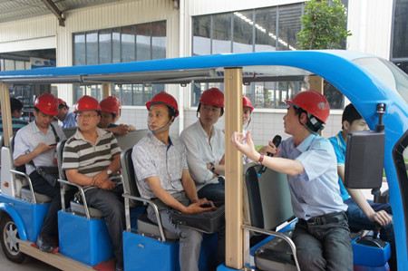 地產(chǎn)采購(gòu)經(jīng)理人在觀光車(chē)上巡視奮安集團(tuán)各個(gè)車(chē)間