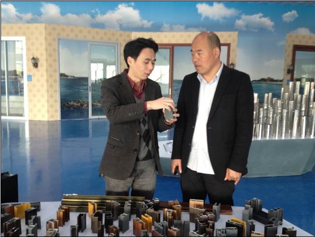 (在門窗體驗(yàn)中心,梁總向貴賓介紹注膠隔熱型材)