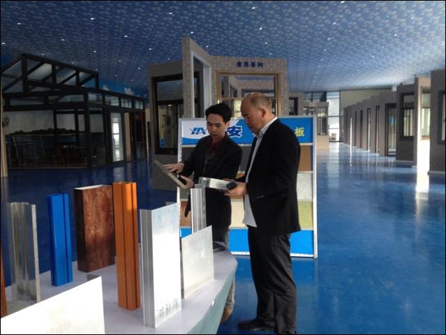 (在門窗體驗(yàn)中心,梁總向貴賓介紹奮安特色鋁單板)