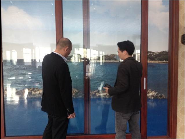 (在門窗體驗(yàn)中心,梁總向貴賓介紹圣羅德系統(tǒng)門窗)